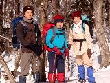 私達4人は、実際に標高1700mの韓国岳を越えて約10`の縦走を行いましたが、とりわけ問題もなく順調に歩き通す事ができました。まだ寒波が残り、時折強風が吹く中を順調に行動できた大きな理由は、まず第一に濡れずにすんだことです。たとえ、気温が低くて強風下であっても、十分な装備と経験と体力があればある程度の行動は可能です。しかし、濡れは大敵です。冬山では、着膨れして自らの汗で衣類を濡らさないように、適切なレイアリング技術を身につける必要があります。 |