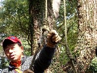 その際、ロープ登行だけではなく、林業で使う木登りの技術も取り入れ、万一に備え、クライミングの技術でバックアップを行うというものです。