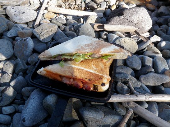 今回は、ちなみにホットサンドでした。写真のホットサンドは、平戸カヤックスの1dayツアーメニューの定番昼食です。平戸カヤックスの調理は、海岸の場合は、基本的に焚き火で行います。