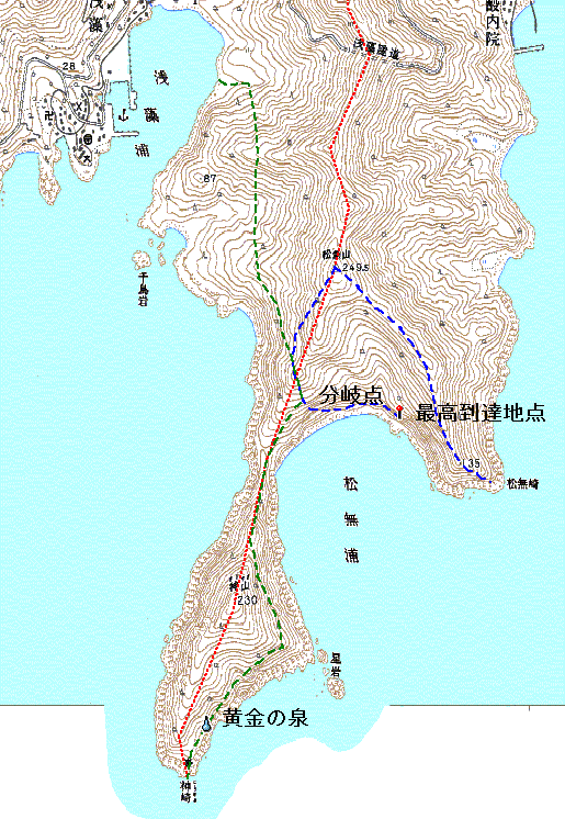 松無崎の先端まで行って間違いに気づいて、松無山までもどらず途中から砂浜の海岸へ下りて海岸から神崎半島の尾根にあがろうと考えたが、松無山まで行ったほうが安全でかつ早いと考え戻ったが、神崎方面への尾根がやぶっているせいか確認できないので、地形図で方位を確認して歩く。途中で、登山道に出て進むべき方位は、違うが巻道で神崎へいくものだと思いそのまま登山道を歩き迷ってしまった。実際には、この道は、豆酘内院から神崎への道ではないかと思う。それを豆酘内院の方向へ歩いていたような気がする。標高150m付近が分岐点になっているようだ。