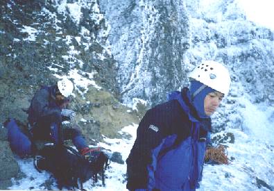 取付で登攀の準備をする高木氏と松崎氏(後)