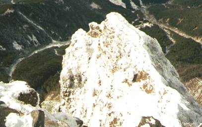 リードは、全て志水氏が行う。ピッケルは、ザックにしまい、登攀中は手袋のみで確保中はオーバー手袋も装着した。特に1ピッチ目の下部は、傾斜もゆるく簡単みえたが、初めての冬壁ということで、アイゼンと手袋装着での登攀は、思った以上に困難で慣れがいると感じた。特に1ピッチ目の上部と2ピッチ目のチムニーの登攀では、あまり体を奥まで入れてしまうとザックがひっかかってしまい登りずらかった。ホールドは、さすがに豊富で大きいが、浮石も多い。支点は、ほとんど岩を利用していたが、見落としやすいが、ハーケンもある。1ピッチ目のビレーポイントの支点は、ハーケン1本と比較的新しいリングボルト2本。2ピッチ目のビレーポイントは、右肩にでたところでテラスになっている。分かりにくいが、壁側の下部にハーケンが1本ある。3ピッチ目は、大同心側のバンドをまいて小同心の頭に出た。