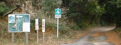 この林道をしばらく歩くと左手に登山口の案内版がたっている。林道入口付近の左手に登り口があるが、登山口ではないので注意がすること。ここからでも登れると思うが薮こぎになる可能性が高い。