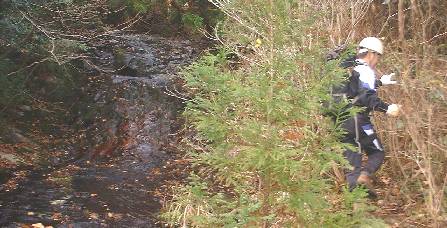 有明山から日掛には、立派な標識もあり地形図にも道が掲載されているが、実際には廃道状態。現在は、測量のため有明峠までは伐採してあり、かなり歩きやすくなっている。峠からは、西へ90度方向をかえ日掛へ降りることになるが、ここからは完全に廃道状態になる。M田氏も以前職場の仲間と有明峠まで来たがそこから日掛への道が分からなかったということだ。峠からは、歩きやすいところを適当に降りて行けば林道に出る。そこから先が非常に分かりづらいが、私は何度も歩いていて道が分かっているので迷わず日掛まで下ることが出来るはずが、迷ってしまいはじめてここに来た時と同様に沢をおりることになった。