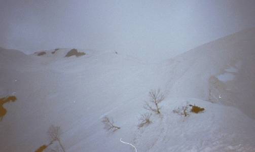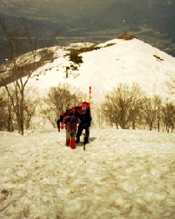 雪山に通って6年目にしてはじめて雪庇を見た。思った以上に大きくせりだしているものだ。春山で雪が固くしまっているので踏みはずしたらタダではすまない。気をつけて登る事にする。
