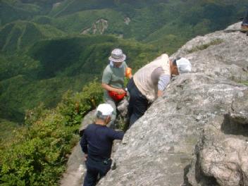 白嶽の山頂直下は、岩場になっており、慣れていない人は、緊張するところだ。ここは、左側を巻くようにして登り下りができるが、もしつまずくとそのまま落下しかねないので写真のように直登(下りも同様)した方が私はむしろ安全と考えている。この時は、岩場に慣れていない人のためにザイルで補助した。ここには、ぜひ安全のための措置をして頂きたい。