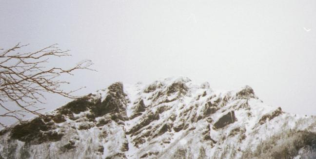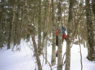前夜かなりの降雪があり、御小屋尾根は下りであるにもかかわらず、ラッセルでかなりのアルバイトをしいられた。冬山を経験して6年目で、はじめてラッセルした。九州の最西端、長崎県人である所以か。浦野氏の現在の山行状況を聞くと、私の冬山の15シーズン分くらいを1シーズンで経験しているようだ。長崎県人である我々は、雪山はせいぜい1年で多くて3回程度だ。正月及びGWのアルプスと2月の大山くらいだ。今度から降雪直後の久重や祖母、阿蘇の氷壁及び冬壁にも積極的に出かけたい。とにかく経験することだ。舟山十字路までは、 ラッセルのために思った以上に時間がかかって到着。