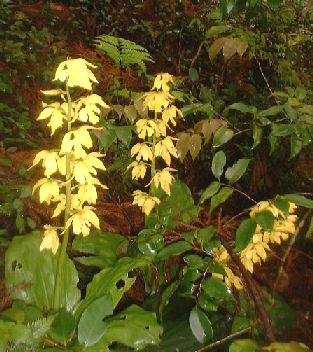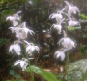濃霧のため視界はきかなかったが、エビネランを多数見ることができた。おまけに黄色だけではなく、白色と薄紫色のエビンランにも出会えた。黄色のエビネランはややおおぶりな花をつけて映えて見えるが、白色や薄紫色のエビネランはこぶりで可憐さを感じた。