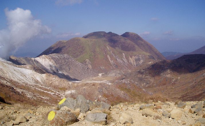 スガモリ越から北千里ガ浜へ下り、久住の分れへ登りつめる。北千里は、広大な盆地状地形で視界が悪い場合は、ルートを見失うので黄色のペイントがいたるところにあった。
