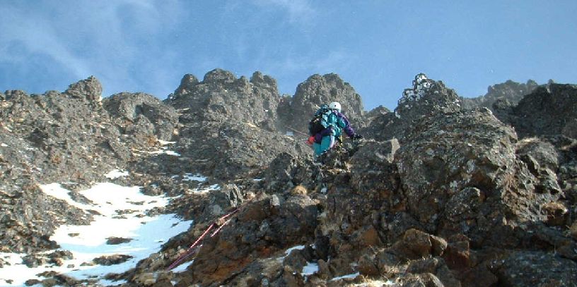 その後は、ブッシュ混じりのリッジを行くことになるが、コンテでそのまま登っていたがザイルが木に引っかかり時間を要す。途中からザイルを片付け先を急ぐ。
