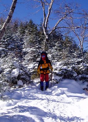 旭小屋からは、樹林帯の急登を登る。雪が少なくアイスバーン状態で歩きづらい。林さんは、普段持ってるストックがなかったので私以上に歩きにくかったと思う。