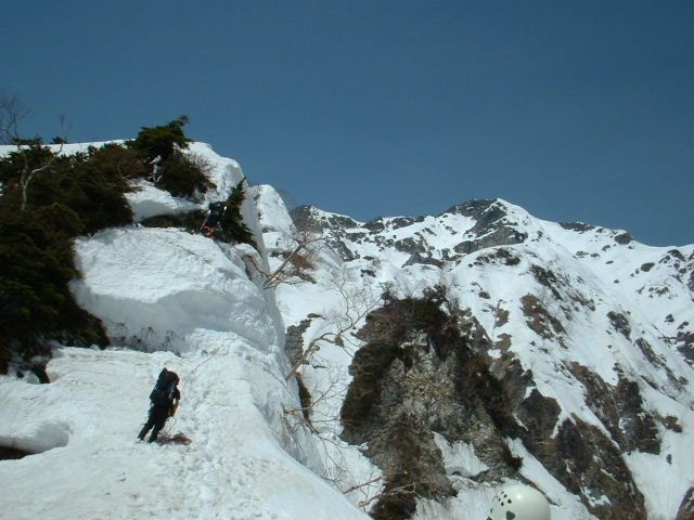 10m程度の潅木混じりの雪稜だが、右手東側の白馬沢側へスッパリ切れ落ちており、安全を期してザイルを出した。