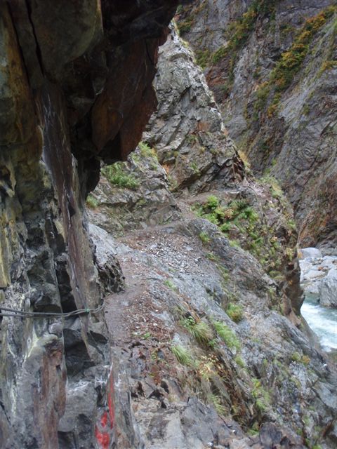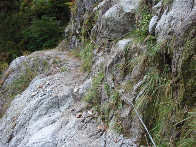 下ノ廊下は、延々と岩壁をくりぬいた登山道を歩きます。はじめは、少し緊張しますが、基本的に一般道ですので、ザイルもアイゼンもなく歩くことができます。