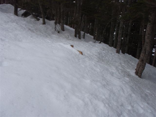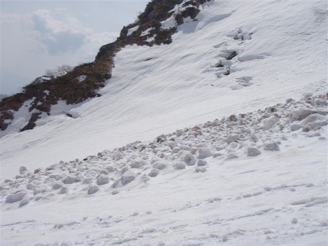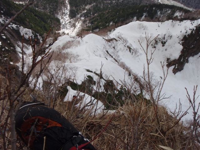 積雪期にはじめての下降に不安は、残りましたが、視界もあり、安定した状態で下降ができました。しかし、枝沢、特に杓子岳からは、いくつもの雪崩の痕跡がありました。