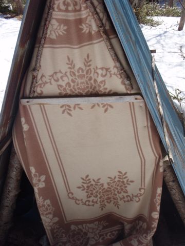 出合小屋のトイレです。鋭角な屋根と毛布の扉が、趣がありますね。