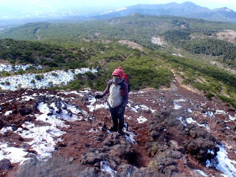 今回の募集プランを考えていた段階から積雪期の登山になると考えていましたが、ちょうど我々の行動プランにあわせたように北極から今年一番の大寒気団が南下してきました。予定通りガイドプランを実行はいたしましたが、状況が悪い場合はいつでも撤退するつもりで出かけました。お客様にとっては、たとえ登頂できなくても冬山の厳しさを垣間見ることができ、十分に今後の登山に役にたつと考えた上での出発でした。霧島は、雪もなく写真のように絶好の登山日和のように感じられました。山を見上げている限りでは、とても強風が吹いているようには感じませんでしたが、山頂付近は一時的に風速20m以上の強風でしが、視界もあり、雪は少なく乾燥した状況でしたので、行動に支障はありませんでした。