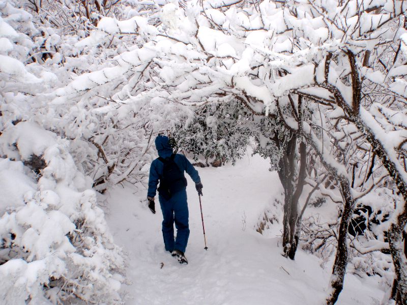九州の冬山でも、今回のように寒気南下している場合は、完全な冬山装備の必要性を感じました。このような天候であっても、軽装備の登山者もおり、足取りもしっかりして特に問題はないような気もしましたが、いったん視界がなくなったり、雪が湿っている場合などは遭難につながる可能性もあるのではと感じながら登っていました。