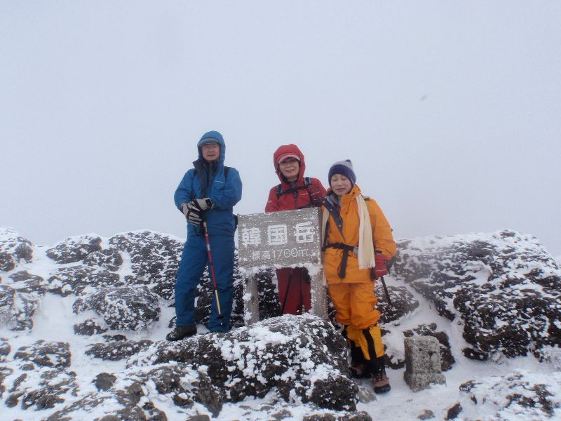 私達4人は、実際に標高1700mの韓国岳を越えて約10`の縦走を行いましたが、とりわけ問題もなく順調に歩き通す事ができました。まだ寒波が残り、時折強風が吹く中を順調に行動できた大きな理由は、まず第一に濡れずにすんだことです。たとえ、気温が低くて強風下であっても、十分な装備と経験と体力があればある程度の行動は可能です。しかし、濡れは大敵です。冬山では、着膨れして自らの汗で衣類を濡らさないように、適切なレイアリング技術を身につける必要があります。 |