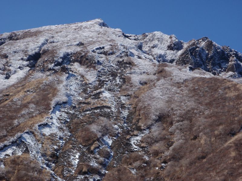 九州の山で、雪道を歩こうと思えば、北斜面の登山道を歩くことです。写真はありませんが、平治岳北尾根は50cm程の積雪がありました。一方、下りの南斜面は、雪がないところもあるなど、極端な状態です。九重で最も雪が多いのは、三俣山山頂付近北斜面だと思うのですが・・・・・?。