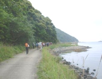 浅藻から神崎半島へ行くには、湾のふちに沿ってコンクリートの道があるのでここを車で行けるところまで行った方が早いが、マイクロバスは入らないので神社前の空地に車を止めて歩く事にした。ちなみにマイクロバスは、この空地までもはいることはできないのでさらに少し手前で下車する事にした。