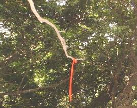 この登山道?を歩いて神崎半島の先端まで歩く人はあまりいないようで、道が不明瞭(詳細なルートは、3月20日の山行で確認)なので要所に赤の布切れを目印に残した。前回歩いたのは、3月だったのでこの時からすればかなりやぶっていて、時間がかかりそうだ。