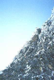 鉱泉で朝食をとって6時30分に出発。取付きまでは、赤岳鉱泉から硫黄岳の登山道を5分ほど歩き、大同心の道標に沿って右折してそのまま大同心稜を登る。取付までの標高差は、約450m。大同心には、すでに取付いているパティーもいる。小同心クラックの取付までは、大同心基部の岩のバンドをトラバースして、ルンゼ上部を右上する。