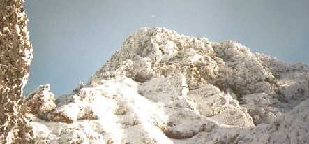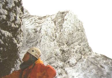 リードは、全て志水氏が行う。ピッケルは、ザックにしまい、登攀中は手袋のみで確保中はオーバー手袋も装着した。特に1ピッチ目の下部は、傾斜もゆるく簡単みえたが、初めての冬壁ということで、アイゼンと手袋装着での登攀は、思った以上に困難で慣れがいると感じた。特に1ピッチ目の上部と2ピッチ目のチムニーの登攀では、あまり体を奥まで入れてしまうとザックがひっかかってしまい登りずらかった。ホールドは、さすがに豊富で大きいが、浮石も多い。支点は、ほとんど岩を利用していたが、見落としやすいが、ハーケンもある。1ピッチ目のビレーポイントの支点は、ハーケン1本と比較的新しいリングボルト2本。2ピッチ目のビレーポイントは、右肩にでたところでテラスになっている。分かりにくいが、壁側の下部にハーケンが1本ある。3ピッチ目は、大同心側のバンドをまいて小同心の頭に出た。