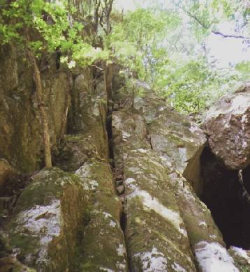 この滝は、左のバンド状を登る事になる。滝そのものは雨が降らないかぎりは乾いていると思うが、こけが多く通常の岩とは勝手が異なる。ビレイヤーにも一段上がってもらい確保をお願いする。最上部に腐りかけたハーケンが2本あるが十分な強度はない。その他は全く支点はない。まず最初の一歩がでず、なかなか登ることができない。困難ではないのだが、最初の支点がとれないのだ。ナッツで支点をとりはしたがふんぎりがつかない。前回、自分はどうやって登ったのかなあと悩んでしまう。しばらく、岩に登っておらず勘が鈍っているようだ。写真でもわかるようにバンドと平行してクラック状の溝があるがそこに石が詰まっており、周りの土を払いのけるとCSになっていたのでそこにシュリンゲをかけて支点をとる。今度は、しっかりとした支点がとれ安心して登れる。後は同様にいくつかの支点をCSとナッツおよび木の根からとり登る。支点さえ取れれば問題なく登れる。最後は、いったん滝の上まで登り木を支点にして懸垂で降りることになる。15mのCS滝をリードする場合は、多めのシュリンゲとハンマー及びハーケンも持った方が良い。前回は、良くきいたハーケンを1本うった後回収したのだが、自分でもどこにうったか今回分からなかった。この滝のリスは、せまく薄いハーケンが都合が良いだろう。