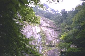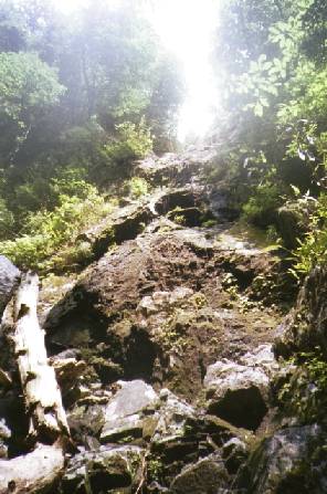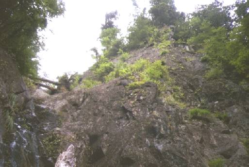 滝の落ち口を横切りこの壁の左手のやぶと岩場のミックスしたようなところを登る。ここでもザイルが必要となる。