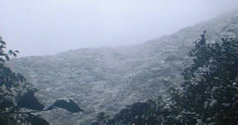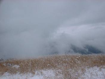 初日に登った日は、山頂の道標にツェルトを張って、ラーメンを炊いて昼食をとった。せまいツェルトでストーブをたくとすぐに暑いくらいになるのだが、この日は、風が強くかなり冷え込んでいたせいかいつまでも寒かった。ところで、私は、いつも積極的にツェルトを使用している。本当に必要に迫られて使用したのは、まだ、スズタケが整備される前に登った祖母傾の縦走路でのビバークの1回きりだが、せっかく高いお金を出して買ったのだから、また、非常時にスムーズに使用できるためにもこうやって普段から使用している。意外とツェルトは持っているけど使用したことがないとか、めんどうだからあまり持ち歩かないという人は多いようである。