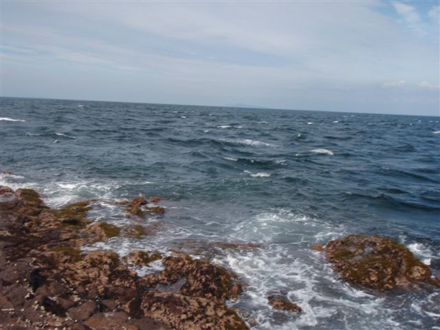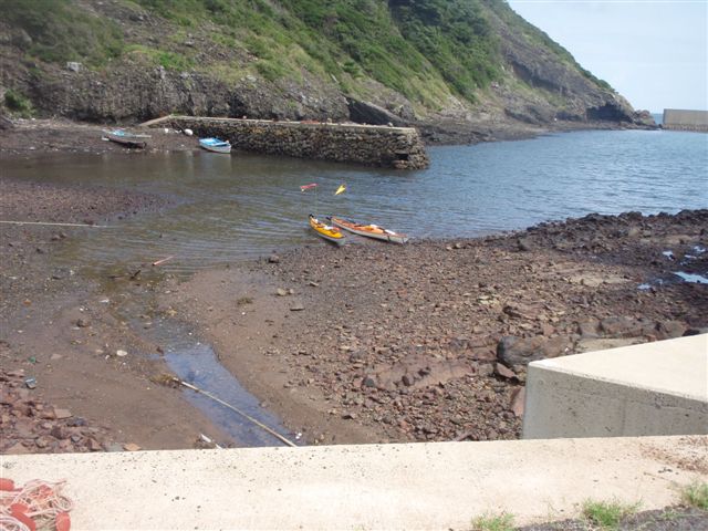 はじめての沈脱でした。実際に複雑な三角波の中でのレスキューは大変でした。牽引しても全く前進することができずに、結局、岩場に這い上がり、カヤックを岩場に引き上げました。