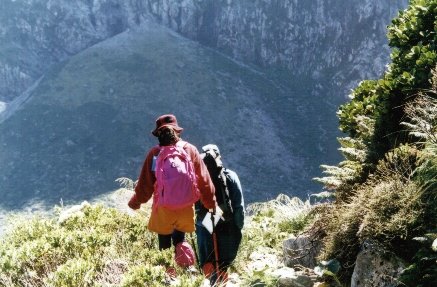 本コース唯一のアップダウン。今日は、マッキノン峠(約1.500m)を越えなければならない。この峠の登り下りだけが登山という感じ。下りは、何個所か足場が悪いところもある。峠は、わずかに1,500mだが高緯度のせいか植生を見ると日本の標高2,500〜3,000mに匹敵する感じだ。