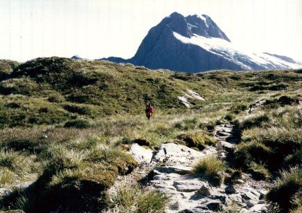 最終日は、サンドフライまで緩やかな下り。途中、コースの整備をしている人をみかけるが、登山道の整備は本当に大変のようだ。ミルフォードトレッキングは、半年間がシーズンで残りはオフ。コース上に雪崩の巣がもあり、毎年橋を架け替えるところもあるという。関心したのは、コースの標識が柔らかいゴム製のものでできており、雪崩にあっても折れない作りになっていた。