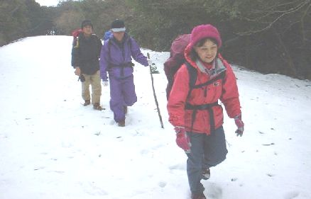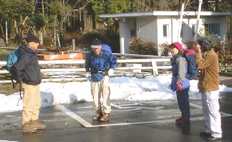駐車場から栗ノ木峠へ続く道路から歩きはじめる。地元出身の私をはじめここから登るのは初めてということで、地形図で確認しながら歩く。すぐに送電線の下に九州電力の作業道があったのでここから栗ノ木峠へ直登する。峠には水場があり積雪の中、水汲みの人がいる。