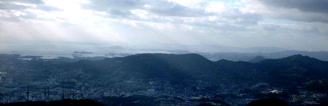写真の中央付近に薄く見える三角錐の山が平戸の志々伎山である。栗ちゃんとは鹿子前から黒島をえて3泊4日で平戸をカヌーで一周したことがある。