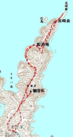 電柱沿いの道をたどるといったん海岸に出る。しばらく海岸を歩くと船着場に至る。 ここから稜線に戻り鞍部から半島東側の整備された道を歩くとすぐに長崎鼻に着く。 オテドから迷わずくれば1時間30分もあれば十分。 帰りは、オテドへは浜を歩かずに着くことが出来た。 この道の方が歩きやすく速い。 しかし、この道は夏場はやぶがひどく歩けないと思う。 浜沿いから歩いた方が良いだろう。
