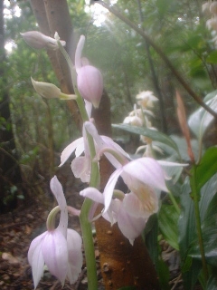 濃霧のため視界はきかなかったが、エビネランを多数見ることができた。おまけに黄色だけではなく、白色と薄紫色のエビンランにも出会えた。黄色のエビネランはややおおぶりな花をつけて映えて見えるが、白色や薄紫色のエビネランはこぶりで可憐さを感じた。