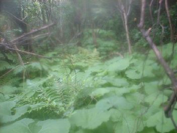 約2時間でやっと稜線へ出る。右へしばらく行けば萱場山のはずだ。しばらく歩いても山頂に出ないので木に登って山座同定を試みるが霧のため視界がきかない。やっと久和の港が確認できた。何と萱場山の左側につめたつもりが、右側だったようだ。コンパスで方角を確認して進むと見慣れた山頂へ出た。