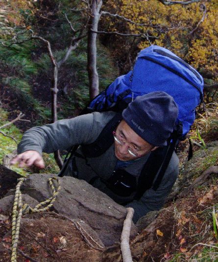 三俣山北峰に突き上げる尾根の難所を登る宮田さん