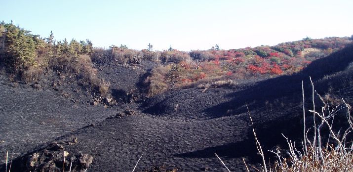 北峰には、紅葉目的の多くの登山がいた。その中の一人から昨日、雨ガ池で火災があったことを知らされ、北峰から雨ガ池方面を望むと黒く焦げているのが確認できた。