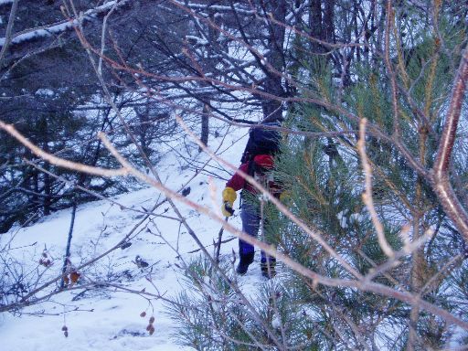 旭小屋からは、樹林帯の急登を登る。雪が少なくアイスバーン状態で歩きづらい。林さんは、普段持ってるストックがなかったので私以上に歩きにくかったと思う。