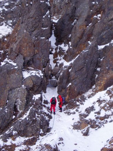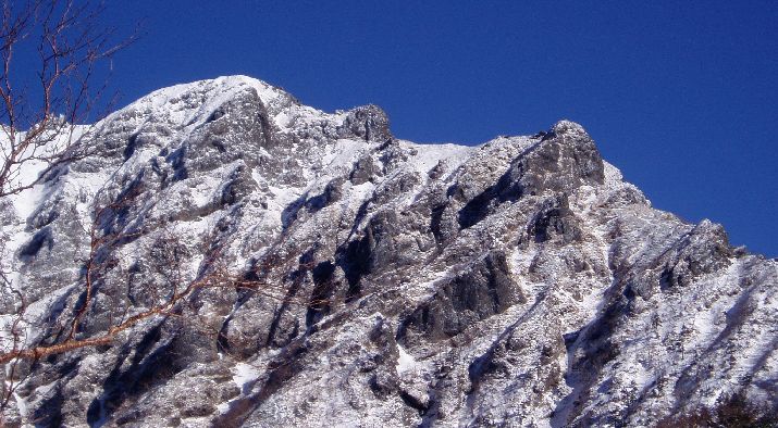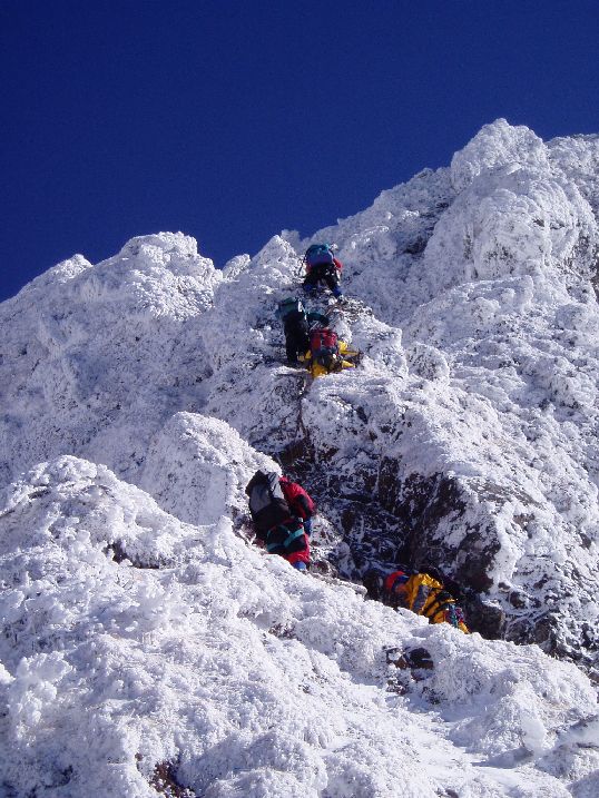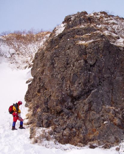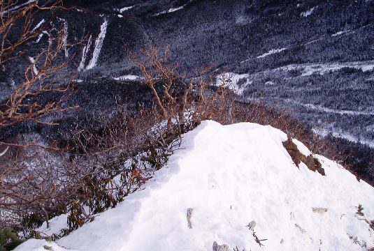 平成14年1月に登った際は、南稜の核心部P3「広河原3ルンゼ最上部のガリー 」は雪があり、念のためにザイルを出した程度といった状態だったが、今回はガリーが氷化していて困難であった。南稜は、雪が少ないと少し難度があがるようだ。平成15年12月現在、フィックスロープもあり支点も整備されているので問題ない。