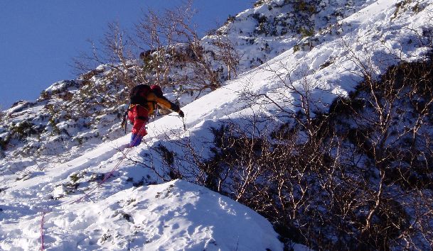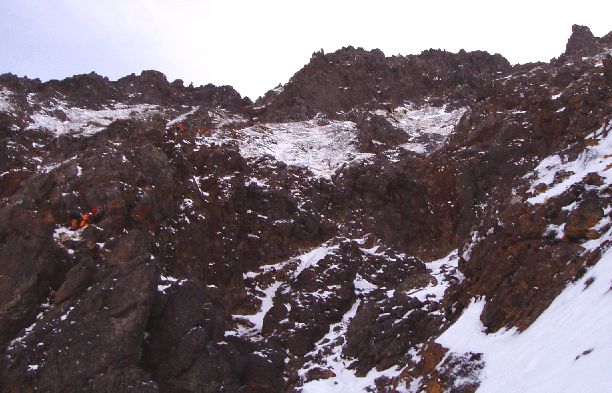 その後は、ブッシュ混じりのリッジを行くことになるが、コンテでそのまま登っていたがザイルが木に引っかかり時間を要す。途中からザイルを片付け先を急ぐ。