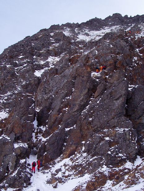 取付手前で順番待ちをしている間に登攀のため、ダウンのベストを着込む。登攀中は少し暑くなるくらいに着込む。縦走時に比べて長袖下着とダウンベスト、タイツをよけいに着込んだ。