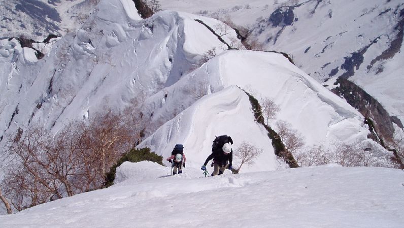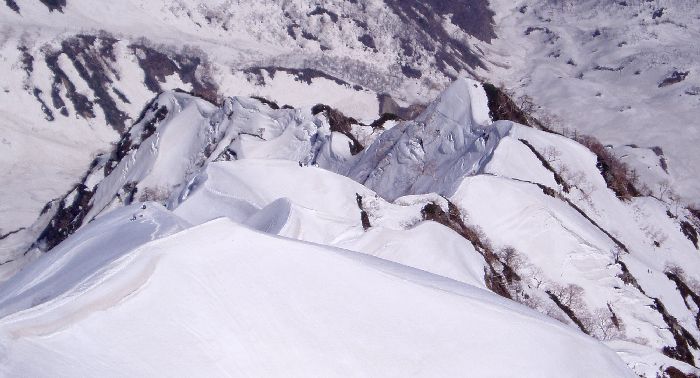 10m程度の潅木混じりの雪稜だが、右手東側の白馬沢側へスッパリ切れ落ちており、安全を期してザイルを出した。