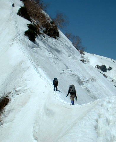 所々雪壁がはがれ落ちて登りづらい。