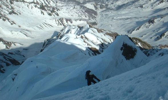 ラスト1ピッチ。主稜最後の難関、頂上雪壁だ。ノ―ザイルで行く事にした。日がかげり少し肌寒い。早く完登したい。ダブルアックスで1歩1歩慎重に登る。頂上の稜線が見えてきた。時計は午後3時30分を回っていた。