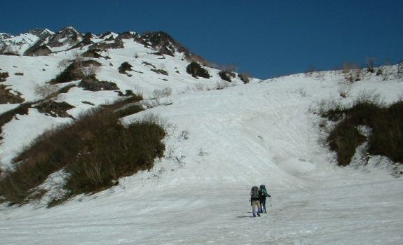 猿倉から白馬尻までは、夏道通りにたどる事が出来、まったく問題ない。最高の天気で30分も歩くと汗だくだ。白馬尻の台地から大雪渓を横切り、主稜に取付く。