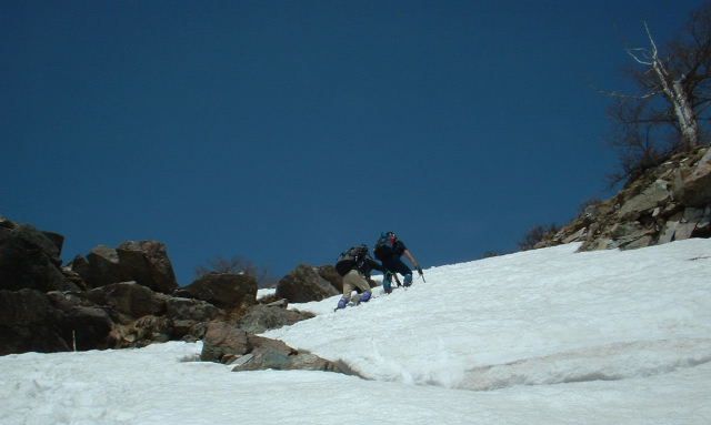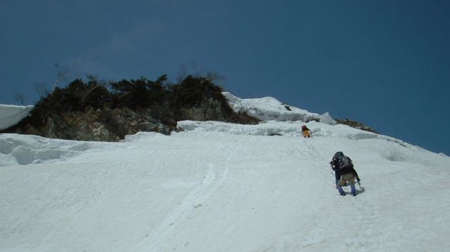 最後の雪壁を登攀する栗山