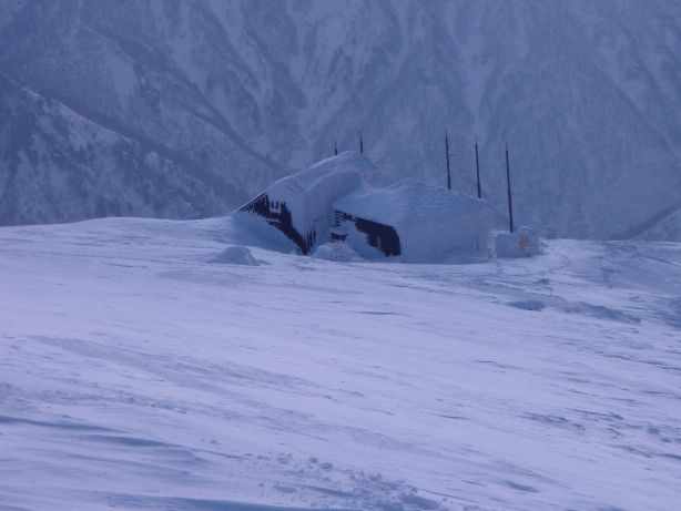 翌朝は、8時から行動しましたが、前日に頂上小屋まであと2時間と思ったところが、5時間もかかりました。昨日、早めに雪洞を掘って正解でした。冬期の縦走では、遅くとも